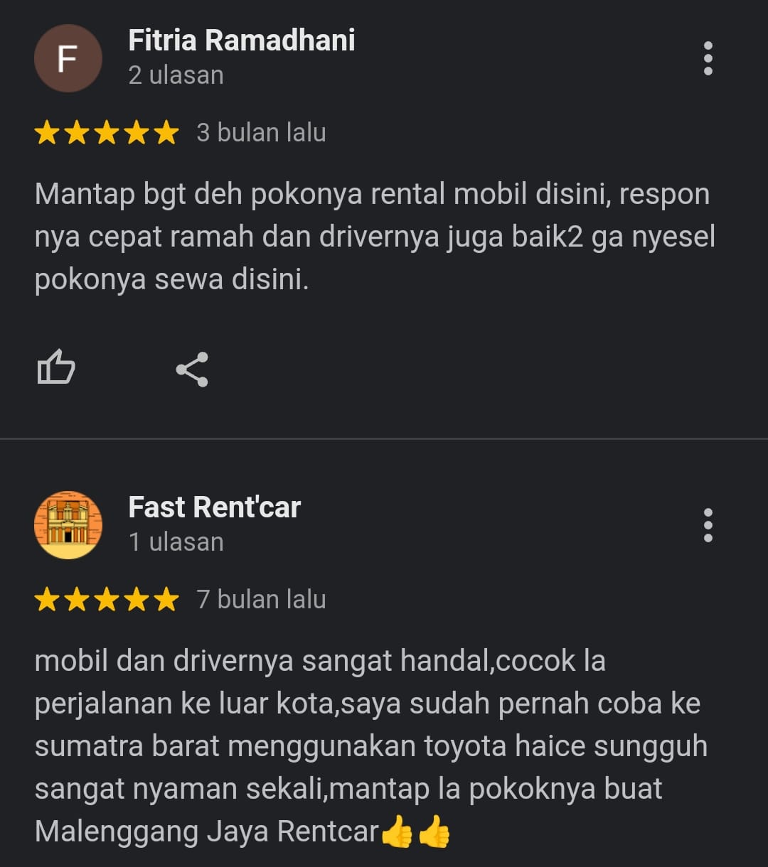 Malenggang Jaya Rent Car adalah penyedia layanan rental mobil terkemuka di Pekanbaru, Riau. Kami menawarkan beragam armada kendaraan yang bersih, terawat, dan harga sewa yang terjangkau. Dengan komitmen pada pelayanan pelanggan yang prima, kami menyediakan penjemputan sesuai permintaan dan sopir berpengalaman yang ramah untuk memastikan pengalaman perjalanan yang nyaman dan memuaskan bagi setiap pelanggan kami.